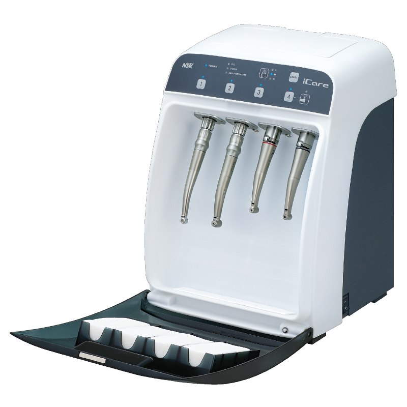 iCare sets a new standard for hand piece maintenance systems. In one stylish and compact body, it offers you both ease of use and multiple functions to achieve complete cleaning and lubrication. The proper solution volume is preset based on hand piece type, and maintenance can be initiated at the touch of a button. The chuck cleaning system keeps chucks pristine, and the purging select model lets you alter purge time depending on the situation for truly comprehensive maintenance. Thanks to its stylish and compact body, iCare is also space efficient and totally in harmony with your working environment.